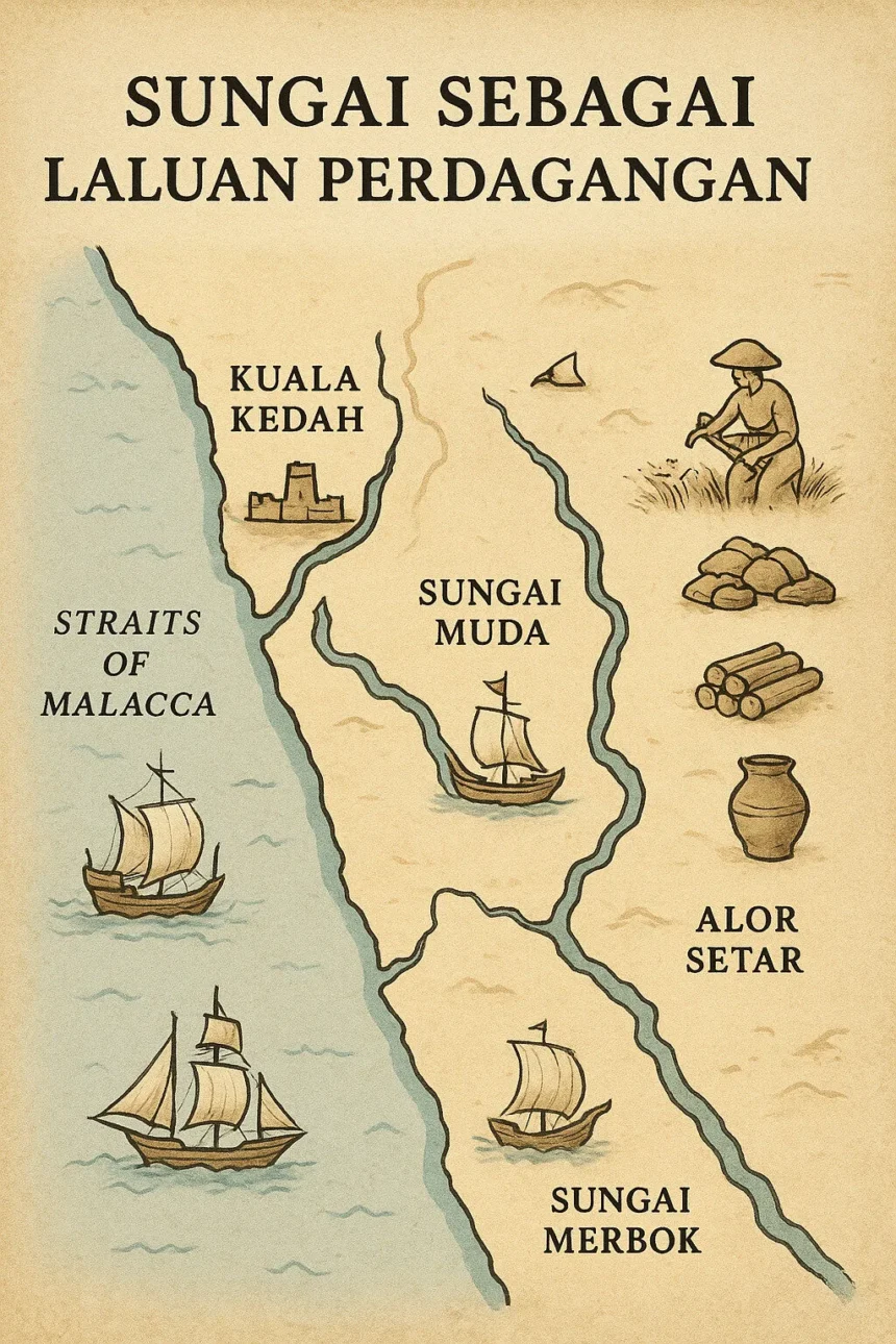 Sejak zaman Kedah Tua, sungai memainkan peranan penting sebagai laluan perdagangan utama yang menghubungkan kawasan pedalaman dengan pesisir pantai dan pelabuhan. Sungai-sungai besar seperti Sungai Kedah, Sungai Muda, dan Sungai Merbok menjadi ‘jalan raya air’ yang membolehkan pergerakan barangan dan manusia dilakukan dengan lebih mudah. Pada masa itu, laluan darat masih terhad kerana hutan tebal dan infrastruktur jalan yang belum wujud, menjadikan sungai pilihan utama pedagang tempatan dan asing.